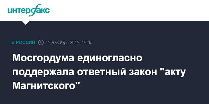 Москва. 12 декабря. INTERFAX.RU - Депутаты Мосгордумы на внеочередном заседании в среду единогласно приняли постановление о положительном отзыве на проект федерального закона, подготовленного в ответ на принятый в Соединенных Штатах "акт Магнитского".