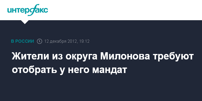 Санкт-Петербург. 12 декабря. INTERFAX.RU - Часть избирателей Виталия Милонова потребовала лишить мандата своего представителя в палате.