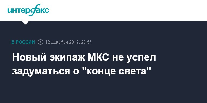 Алматы. 12 декабря. INTERFAX.RU - Основной экипаж корабля "Союз ТМА-07М" готов к предстоящему полету на Международную космическую станцию (МКС), и астронавтов не пугает "конец света" 21 декабря.