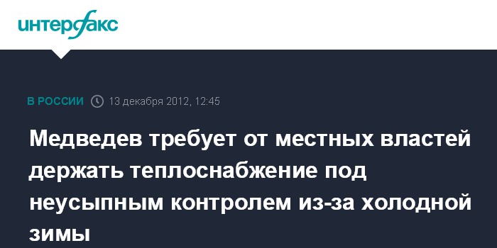 Москва. 13 декабря. INTERFAX.RU - Зима предстоит суровая, местным властям нужно держать теплоснабжение под неусыпным контролем, заявил премьер РФ Дмитрий Медведев.