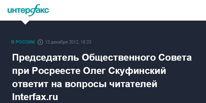 Москва. 13 декабря. INTERFAX.RU - Во вторник, 18 декабря, с 12:00 до 14:00 на сайте Interfax.ru состоится интернет-конференция председателя Общественного Совета при Федеральной службе государственной регистрации, кадастра и картографии (Росреесте) Олега Александровича Скуфинского.