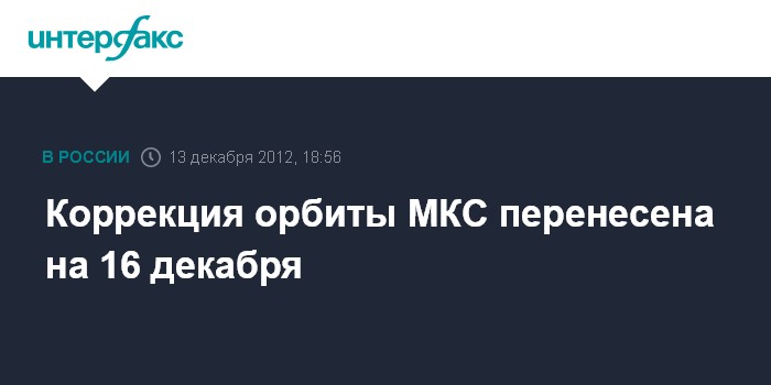 Москва. 13 декабря. INTERFAX.RU - Коррекция высоты орбиты Международной космической станции, которая должна была состояться в четверг вечером, перенесена на 16 декабря, сообщили "Интерфаксу" в Роскосмосе.