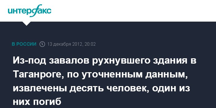 Москва. 13 декабря. INTERFAX.RU - Спасатели извлекли из-под завалов рухнувшего здания в Таганроге 10 человек, сообщил "Интерфаксу" источник в силовых структурах региона.
