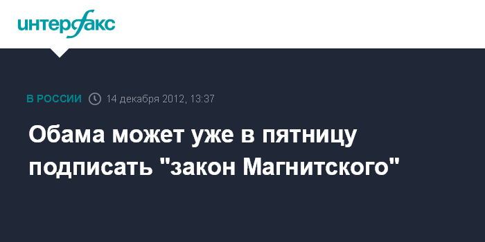Москва. 14 декабря. INTERFAX.RU - По данным России, президент США Барак Обама может подписать "закон Магнитского" уже в пятницу.