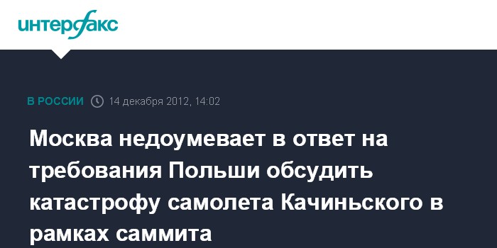 Москва. 14 декабря. INTERFAX.RU - В Москве недоумевают в связи с попытками Варшавы вынести вопрос возвращения обломков потерпевшего под Смоленском катастрофу польского борта номер 1 на уровень саммита РФ-ЕС.