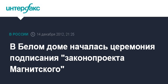 Вашингтон. 14 декабря. INTERFAX.RU - Церемония подписания президентом США Бараком Обамой "законопроекта Магнитского" в увязке с отменой поправки Джэксона-Вэника началась в Овальном кабинете Белого дома.