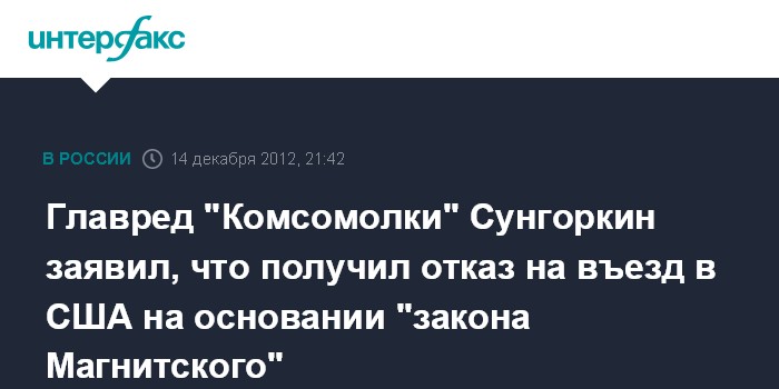 Главред "Комсомолки" Сунгоркин заявил, что получил отказ на въезд в США на основании "закона Магнитского"
