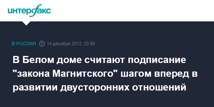 Вашингтон. 14 декабря. INTERFAX.RU - Шагом в развитии двусторонних отношений назвал в пятницу пресс-секретарь Белого дома США Джей Карни подписание закона Магнитского.