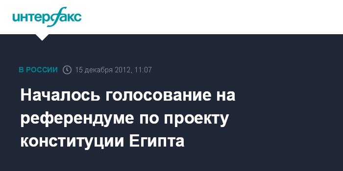 Каир. 15 декабря. INTERFAX.RU - Египтяне в субботу утром начали голосование на первом этапе референдума по проекту новой конституции страны, сообщают местные СМИ. В голосовании принимают участие жители десяти египетских провинций, в том числе и население крупнейших городов Египта - Каира и Александрии. Избирательные участки, как ожидается, закроются в 21:00 МСК.