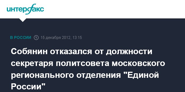 Собянин отказался от должности секретаря политсовета московского регионального отделения "Единой России"