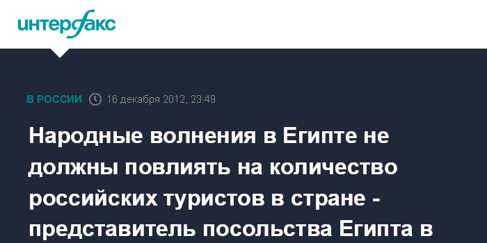 "СМИ преподносят ситуацию в Египте не всегда корректно. Любые происходящие в стране конфликты преподносятся как события всего Египта. Что не является правдой. Но в любом случае, слава богу, события в Египте не влияют существенно на туристический бизнес с Россией. Если обратиться к статистике, в период с января по октябрь 2012 года у нас побывали 1,9 млн россиян. Это немало", - отметила она.