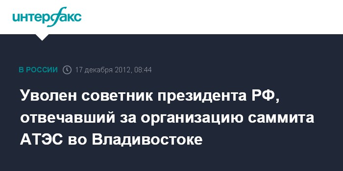 Уволен советник президента РФ, отвечавший за организацию саммита АТЭС во Владивостоке