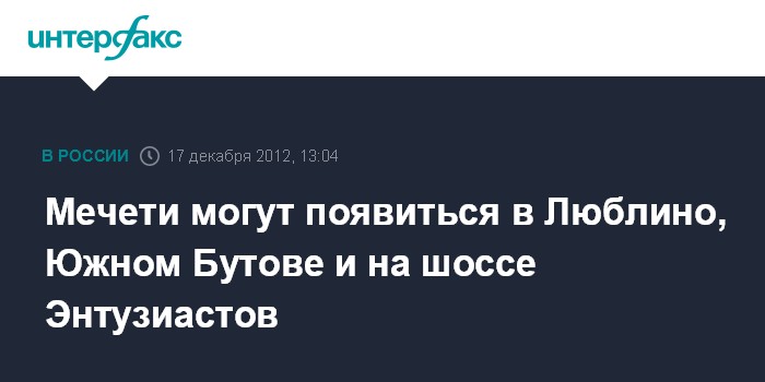"В Духовном управлении мусульман Европейской части России уже знают три участка, которые будут согласованы после нескольких лет обсуждения, - Южное Бутово, Люблино и окрестности станции метро "Шоссе Энтузиастов", - сообщает издание.