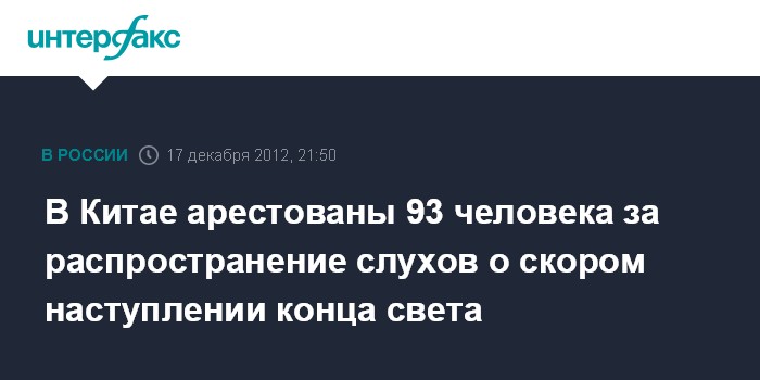 Пекин. 17 декабря. INTERFAX.RU - Власти Китая арестовали 93 человека из семи провинций по обвинению в распространении слухов о наступлении конца света, сообщают в понедельник местные официальные СМИ.