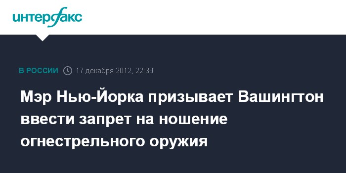 Вашингтон. 17 декабря. INTERFAX.RU - Мэр Нью-Йорка Майкл Блумберг призвал в понедельник власти США всерьез заняться решением проблемы насилия с применением огнестрельного оружия. "Насилие с применением огнестрельного оружия - это национальная эпидемия и национальная трагедия, которая требует больше, чем просто слов", - сказал мэр в ходе пресс-конференции в понедельник.