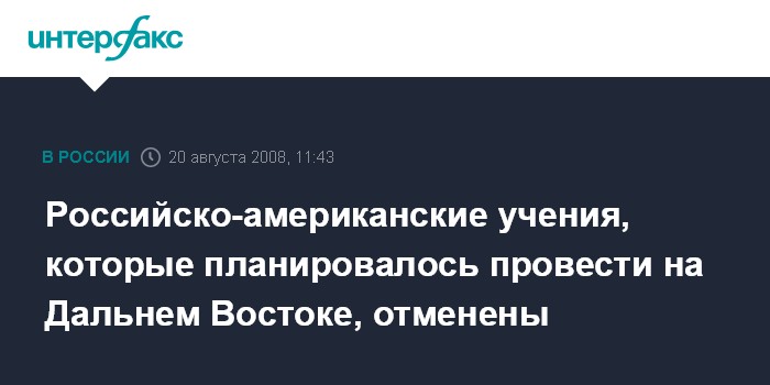 По его словам, "совместные учения, в ходе которых планировалось отработать взаимодействие в борьбе с угрозами воздушного терроризма, были намечены на 28-30 августа". "Недавно было принято решение об отмене этих совместных маневров", - сказал собеседник агентства, напомнив, что Минобороны РФ ранее отказало в посещении России американскому фрегату "Форд", деловой визит которого в Петропавловск -Камчатский был запланирован с 5 по 9 сентября 2008 года.