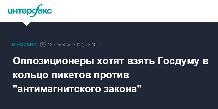 Москва. 18 декабря. INTERFAX.RU - Активисты оппозиции намерены устроить одиночные пикеты против принятия ответного законопроекта на "акт Магнитского" у здания Госдумы в среду, где в это время пройдет второе чтение законопроекта.