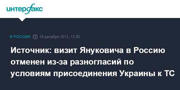 Киев. 18 декабря. INTERFX.RU - Киев и Москва так и не смогли достигнуть согласия по поводу условий присоединения Украины к отдельным положениям устава Таможенного союза, поэтому встреча глав двух государств была перенесена, сообщил агентству "Интерфакс" информированный источник.