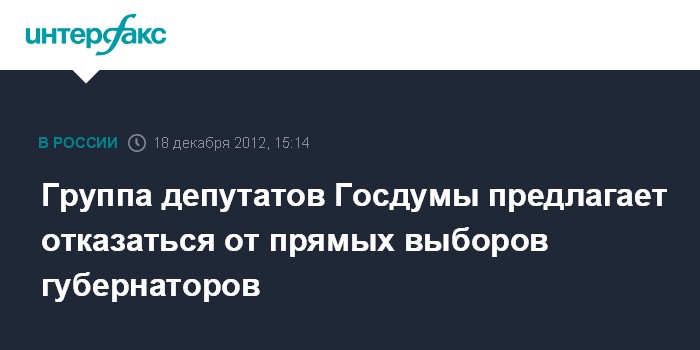 Группа депутатов Госдумы - представителей "Единой России", ЛДПР и так называемой независимой группы (в составе фракции "Справедливая Россия") внесла проект закона, в соответствии с которым глава субъекта РФ может избираться не прямым голосованием населения субъекта РФ, а депутатами Заксобрания.
