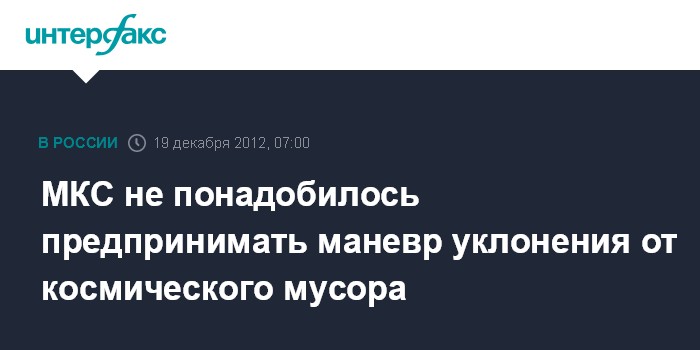 Королев (Московская область). 19 декабря. ИНТЕРФАКС-АВН – Международной космической станции (МКС) не потребовалось совершать маневр, чтобы уклониться от столкновения с фрагментом космического мусора, сообщила «Интерфаксу-АВН» в среду руководитель пресс-службы Центрального НИИ машиностроения Ирина Романова.