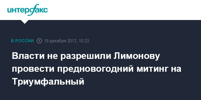 Москва. 19 декабря. INTERFAX.RU - Власти Москвы отклонили заявку оппозиционера и писателя Эдуарда Лимонова на проведение 31 декабря, за считанные часы до Нового года, митинга на Триумфальной площади.