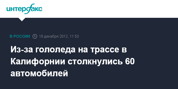 Вашингтон. 19 декабря. INTERFAX.RU - По меньшей мере 60 автомобилей столкнулись из-за гололеда, образовавшегося на автомагистрали в американском штате Калифорния, сообщила в среду пресс-секретарь Калифорнийского управления по лесоводству и защите от пожаров Сьюзи Бреди.