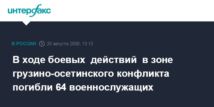 Москва. 20 августа. INTERFAX.RU - В результате миротворческой операции в Южной Осетии погибли, по уточненным данным, 64 российских военнослужащих, сообщил заместитель начальника Генерального штаба Вооруженных сил РФ генерал-полковник Анатолий Ноговицын.
