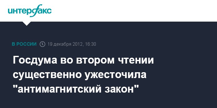 Москва. 19 декабря. INTERFAX.RU - Госдума в среду поддержала жесткие поправки к проекту "антимагнитского закона", который рассмотрела во втором чтении.