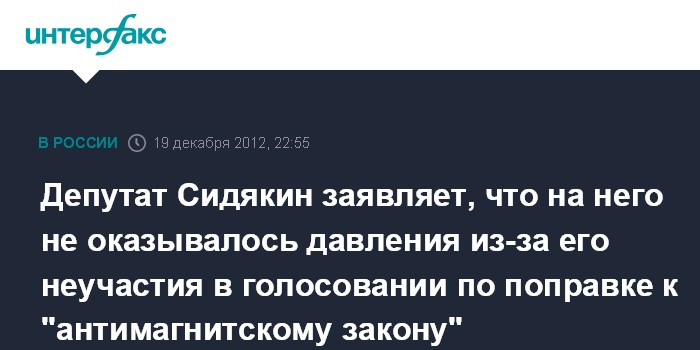 Депутат Сидякин заявляет, что на него не оказывалось давления из-за его неучастия в голосовании по поправке к "антимагнитскому закону"