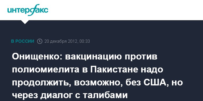 Онищенко: вакцинацию против полиомиелита в Пакистане надо продолжить, возможно, без США, но через диалог с талибами