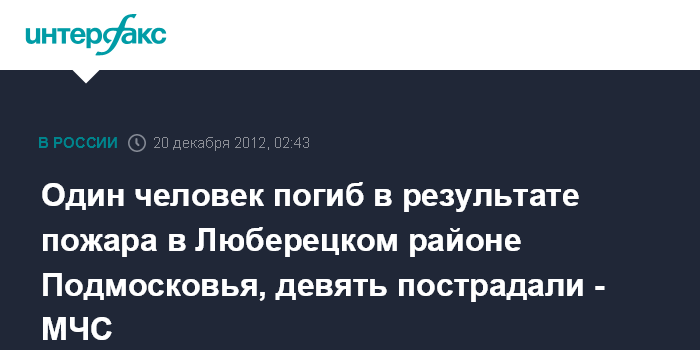 Москва. 20 декабря. ИНТЕРФАКС - Пожар в Люберецком районе Подмосковья унес жизнь одного человека, еще девять пострадали, сообщили "Интерфаксу" в ГУ МЧС по Московской области.