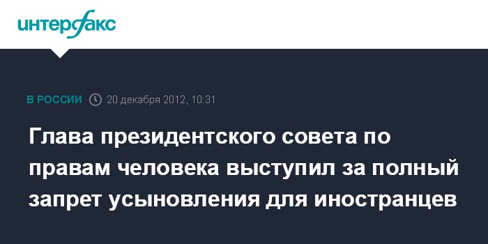 Москва. 20 декабря. INTERFAX.RU - Глава президентского Совета по правам человека Михаил Федотов считает, что в России необходимо ввести полный запрет на усыновление детей иностранцами, но одновременно предлагает создать цивилизованные условия для усыновления сирот российскими гражданами.