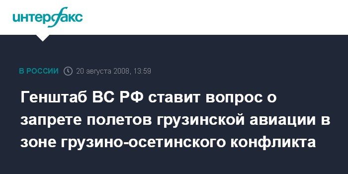 Москва. 20 августа. INTERFAX.RU - Российский Генштаб будет настаивать на том, чтобы над зоной грузино-осетинского конфликта были запрещены полеты грузинской авиации, заявил замначальника Генштаба ВС РФ генерал-полковник Анатолий Ноговицын.