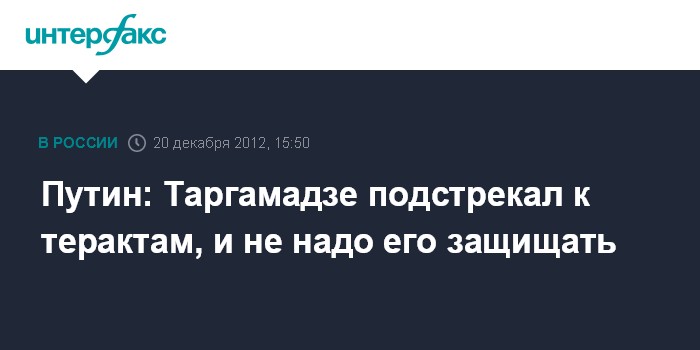 "Он (Г.Таргамадзе - ИФ) совсем не враг Российской Федерации. Он - человек, который пытался подстрекать и до сих пор это делает - российских граждан к совершению противоправных действий, которые могли выражаться в подстрекательстве к совершению терактов и незаконном захвате власти", - сказал Путин на пресс-конференции в четверг в Москве.