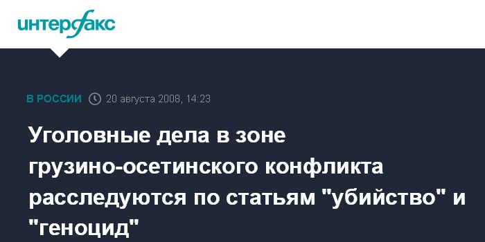 Москва. 20 августа. INTERFAX.RU - Следственный комитет при прокуратуре РФ в связи с событиями в зоне грузино-осетинского конфликта расследует уголовные дела по статьям "убийство " и "геноцид".