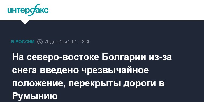 София. 20 декабря. INTERFAX.RU - Власти Болгарии решили ввести чрезвычайное положение на северо-востоке страны из-за непрекращающихся там сильных снегопадов, сообщает в четверг агентство АП.
