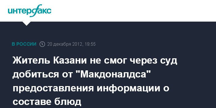 Казань. 20 декабря. INTERFAX.RU - Советский районный суд Казани отказал местному жителю, мусульманину по вере Равилю Файзуллину в иске к ООО "Макдоналдс" о предоставлении информации о составе продуктов питания, сообщили агентству "Интерфакс" в суде.