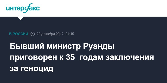 Лондон. 20 декабря. INTERFAX.RU - Бывший руандийский министр Августин Нгирабатваре был приговорен международным трибуналом ООН по Руанде к 35 годам тюремного заключения за геноцид, сообщила телерадиокорпорация BBC.