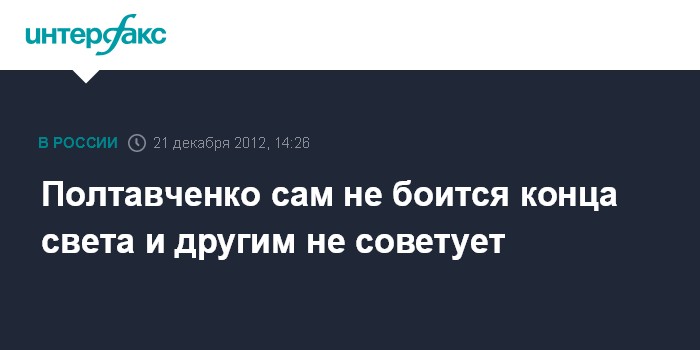 Санкт-Петербург. 21 декабря. INTERFAX.RU - Губернатор Петербурга Георгий Полтавченко не боится конца света, приход которого в пятницу ожидают увлекающиеся историей майя жители планеты Земля.