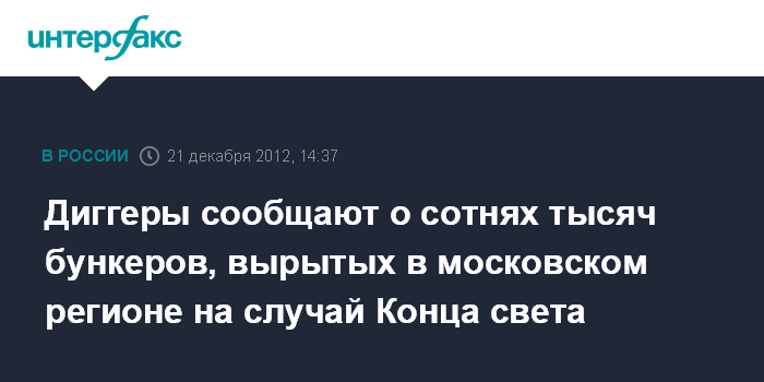 Москва. 21 декабря. INTERFAX.RU - Более полутора миллионов частных бункеров создано в Москве и Подмосковье на случай "конца Света", заявил глава организации "Диггерспас" Вадим Михайлов.