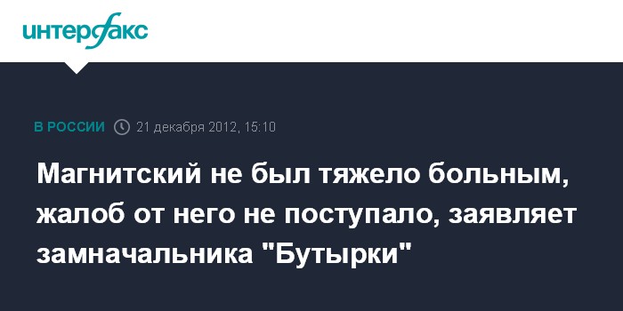 Магнитский не был тяжело больным, жалоб от него не поступало, заявляет замначальника "Бутырки"