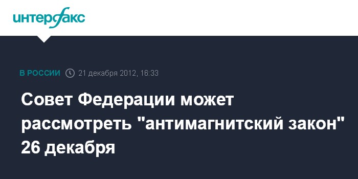 Москва. 21 декабря. INTERFAX.RU - Совет Федерации рассмотрит "антимагнитский законопроект", скорее всего, в среду, 26 декабря, и, по всей видимости, получит одобрение сенаторов.