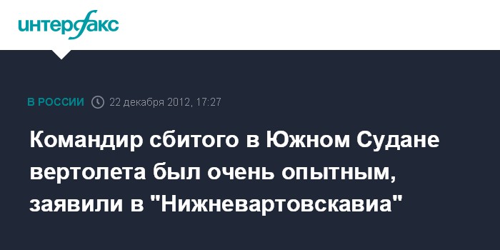 Москва. 22 декабря. INTERFAX.RU - Экипаж разбившегося в Южном Судане вертолета Ми-8 авиакомпании "Нижневартовскавиа", работавший по контракту с Миссией ООН, был очень хорошо подготовленным, заявил и.о. гендиректора авиакомпании Сергей Бакунин.