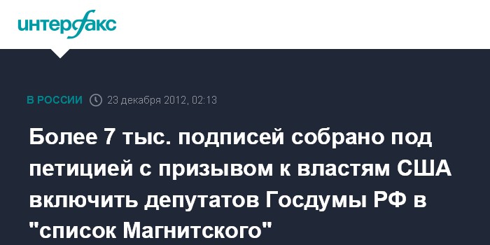 Вашингтон. 23 декабря. ИНТЕРФАКС - Петиция с просьбой распространить действие "закона Магнитского" на депутатов Госдумы РФ, поддержавших "закон Димы Яковлева", размещена на веб-сайте американского Белого дома.