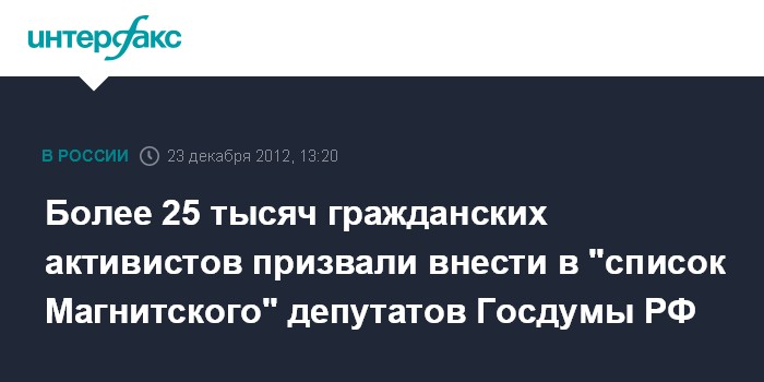 Вашингтон. 23 декабря. INTERFAX.RU - По состоянию на 13:00 мск уже более 25 тыс.400 гражданских активистов призвали Белый дом рассмотреть вопрос о внесении депутатов Госдумы России в так называемый "список Магнитского".