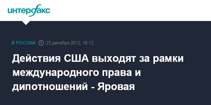 Москва. 23 декабря. INTERFAX.RU - Глава комитета Госдумы по безопасности и противодействию коррупции Ирина Яровая заявила, что США вмешиваются во внутреннюю политику России, выступая против принятых в стране решений. "Действия США направлены против легитимных решений, принятых парламентом России, вышли за рамки международного права, дипломатических отношений и уважения суверенных прав другой страны", - цитирует И.Яровую пресс-служба думского комитета.