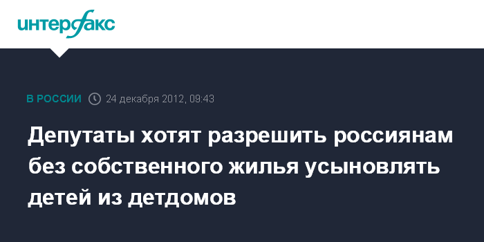 "Согласно разрабатываемому пакету законопроектов, взять ребенка из детского дома смогут даже люди, живущие в съемных квартирах или имеющие в собственности жилье небольшого метража. Единственное непременное требование, которое законодатели хотят оставить, - наличие российского гражданства", - сообщает издание со ссылкой на первого зампреда комитета по вопросам семьи Ольгу Баталину и члена того же комитета Елену Сенаторову.
