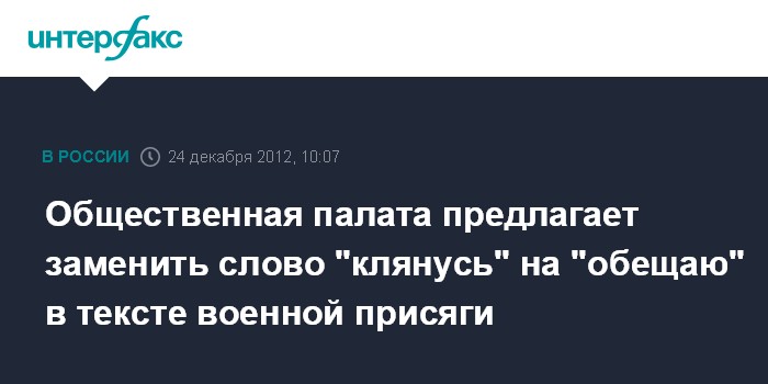 Москва. 24 декабря. INTERFAX.RU - Общественная палата (ОП) предложила Минобороны, Госдуме и администрации президента заменить в тексте военной присяги слово "клянусь" на "обещаю", пишет газета "Известия" в понедельник.