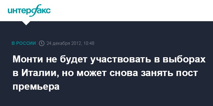 Рим. 24 декабря. INTERFAX.RU - Подавший в отставку председатель совета министров Италии Марио Монти не будет участвовать в парламентских выборах, но, несмотря на это, при определенном стечении обстоятельств готов вновь занять пост премьера, сообщило местное телевидение. "Я не буду кандидатом на выборах, даже если и буду в дальнейшем претендовать на какую бы то ни было руководящую должность. Я и так - пожизненный сенатор", - сказал Монти.
