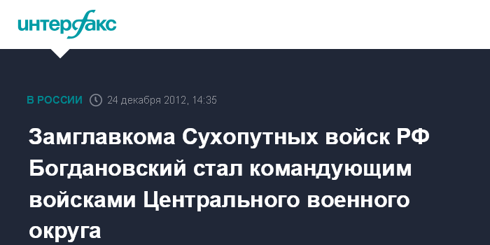 Екатеринбург. 24 декабря. INTERFAX.RU - Командующим войсками Центрального военного округа назначен генерал-полковник Николай Богдановский, сообщил "Интерфаксу" в понедельник руководитель пресс-службы округа полковник Ярослав Рощупкин. "В ближайшее время в штабе округа состоится торжественная церемония вручения генералу Богдановскому штандарта командующего", - сказал Рощупкин.
